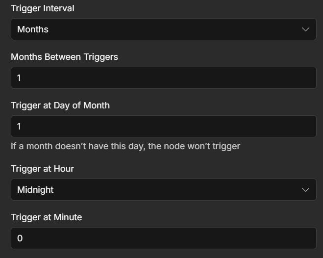 매월 1일 자정, 자동화를 시작 조건을 정의하는 노드이다.