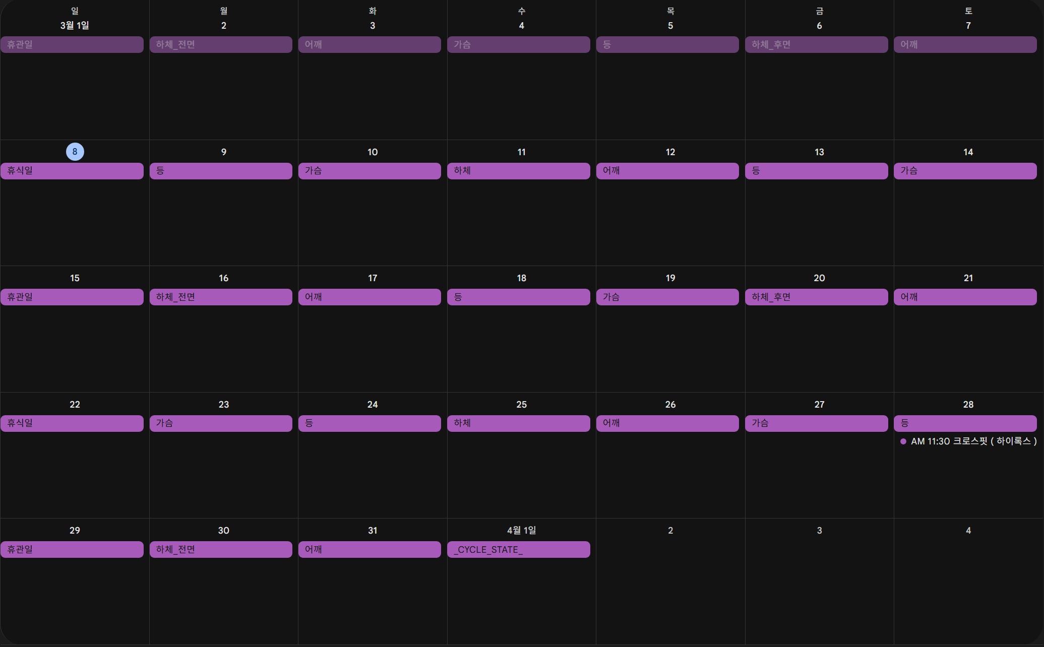 혼자 운동하기도 하지만 보통 파트너들과 같이 운동을 하다 보니 매월 1일이 되면 이번 달 스케줄을 일일이 작성해야 했다. 너무 귀찮다.