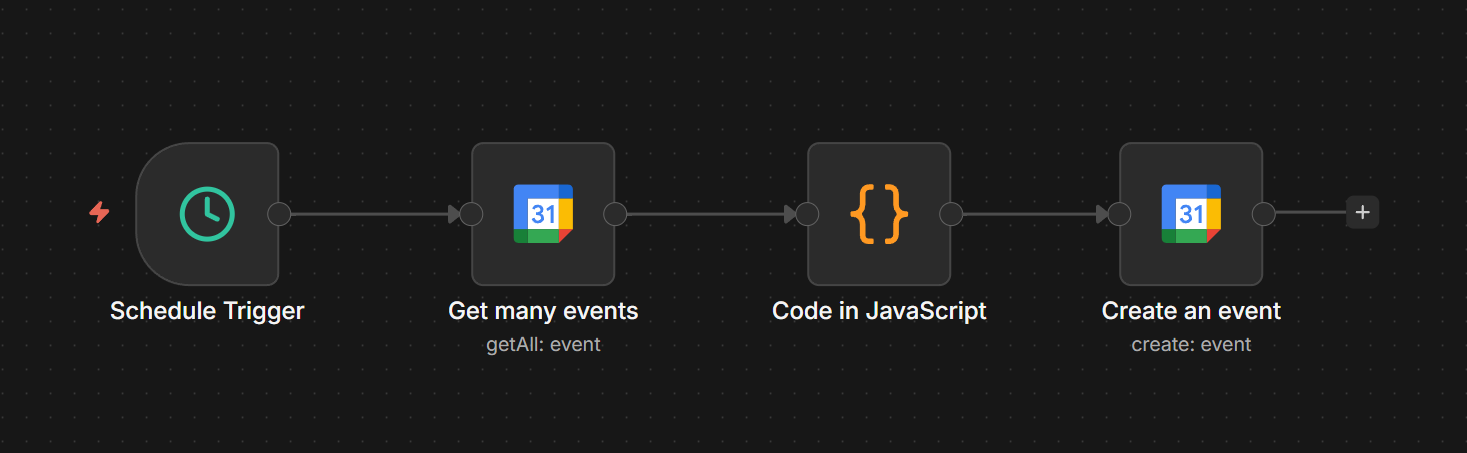 그래서 결심했다. 서버에 몇 달째 잠자고 리소스만 차지하는 n8n을 사용하기로 했다. 매월 1일 자정이 되면, Google Calendar의 WorkoutRoutine 확인하고 이번 달 루틴을 쫙 채워주는 자동화를 직접 만들어보기로 했다. 요즘 우리 생활 속에서 한 자리를 차지한 LLM을 사용하는 사치를 부리기엔 너무 작아 공부 겸 수동 작업 해보기로 했다.