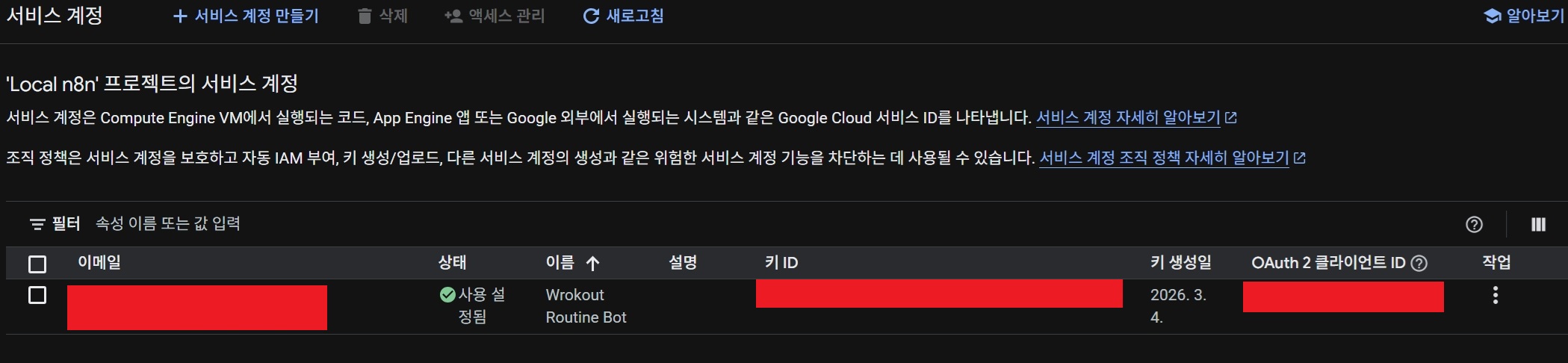 즉, 나의 본 계정을 통째로 연동하는 대신, 가상의 비서를 하나 채용해서 신분증(JSON 키)을 내 n8n에 쥐여주고 구글로 찾아가게 하는 방식이다. 이 방식은 철저히 내부망에서 구글 서버로 나가는(Outbound) 통신 이라, 내 서버의 외부 포트를 열 필요가 전혀 없는 최고의 해결책이었다.