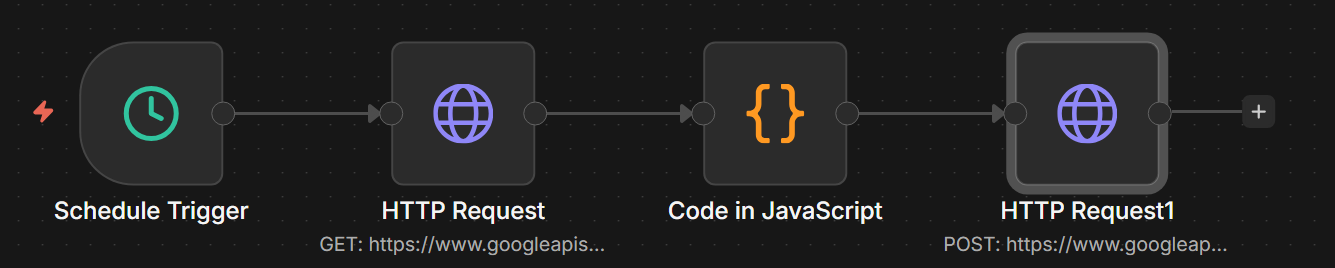 기존 1편의 Google Calendar [POST] 노드도 지우고, HTTP Request 노드로 교체한다. 이 노드는 구글의 까다로운 All Day 이벤트 규정에 맞춰 달력을 쓴다.