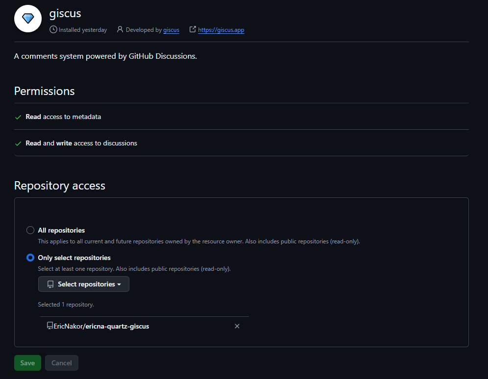 • Repository > Settings > Integrations > GitHub Apps > giscus > Configure